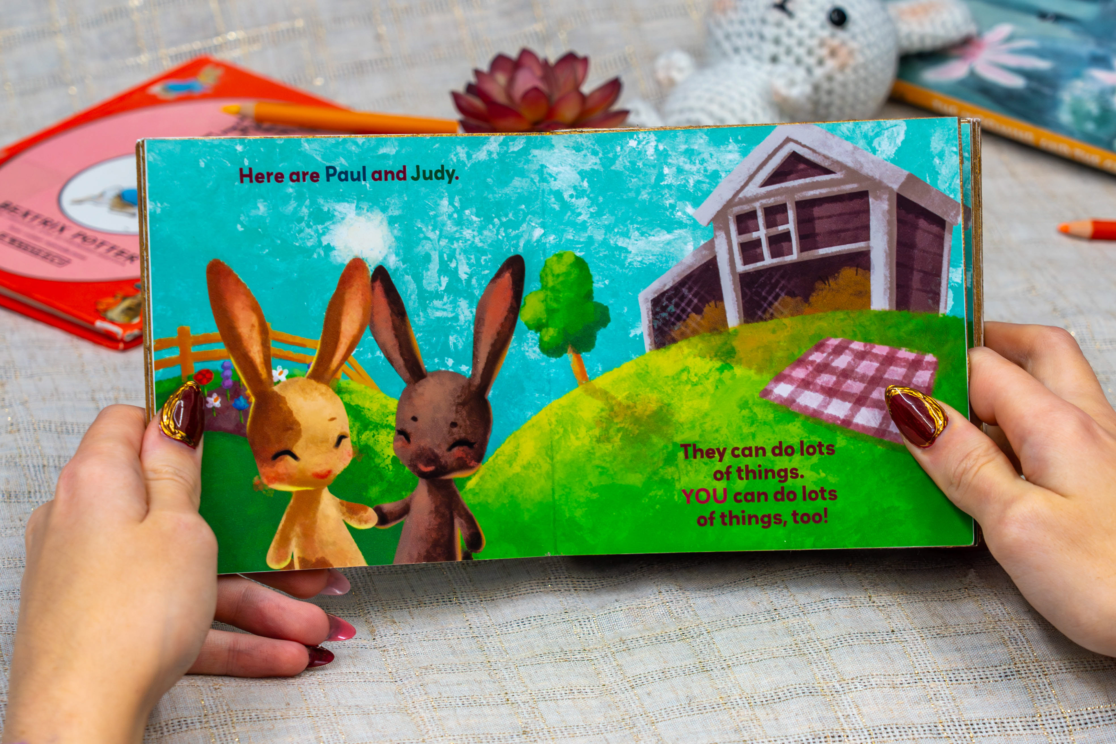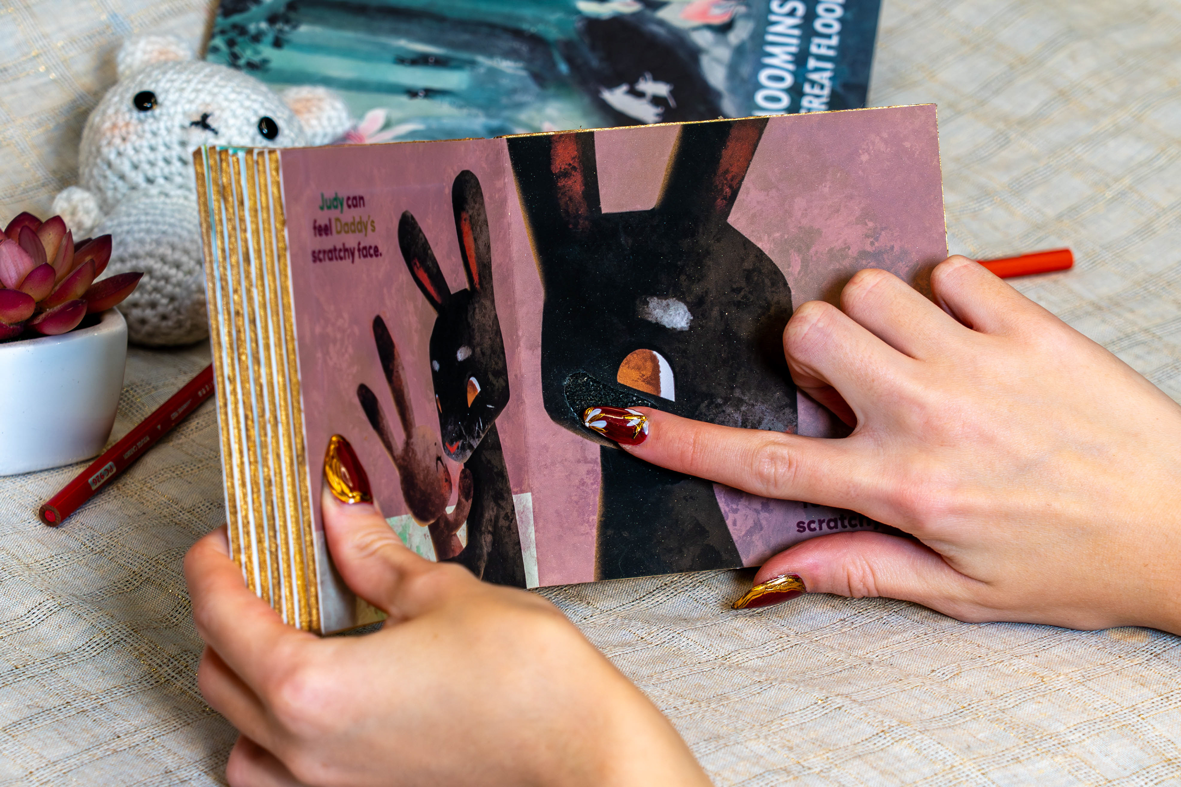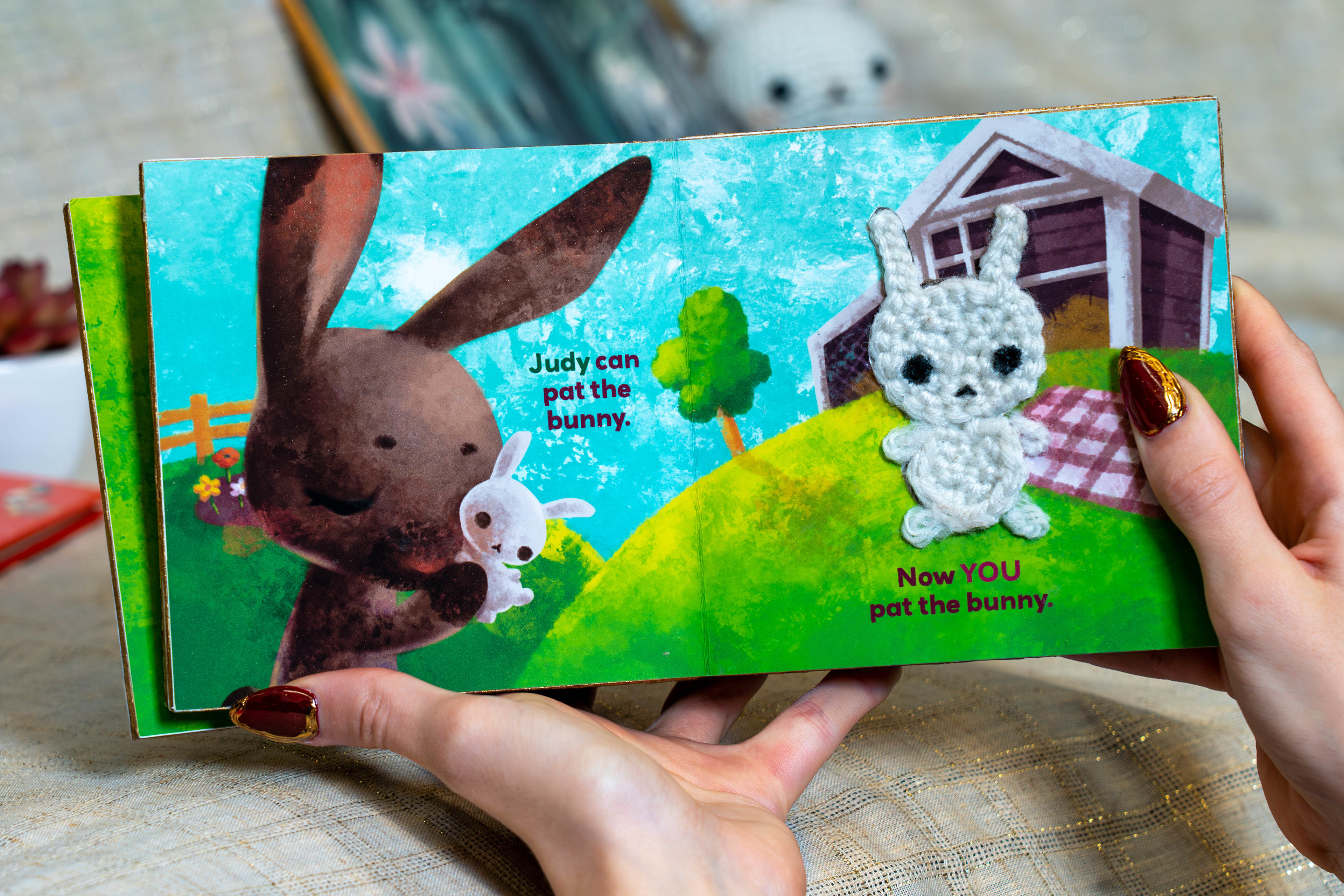 Making the characters bunnies also resolves common misunderstanding of the book. Many new readers interpret “Pat the Bunny” as a name, not an action. They end up confused to see the story is about human children, and that the bunny is just one feature. Incorporating a new bunny-world eases the gateway into the story.