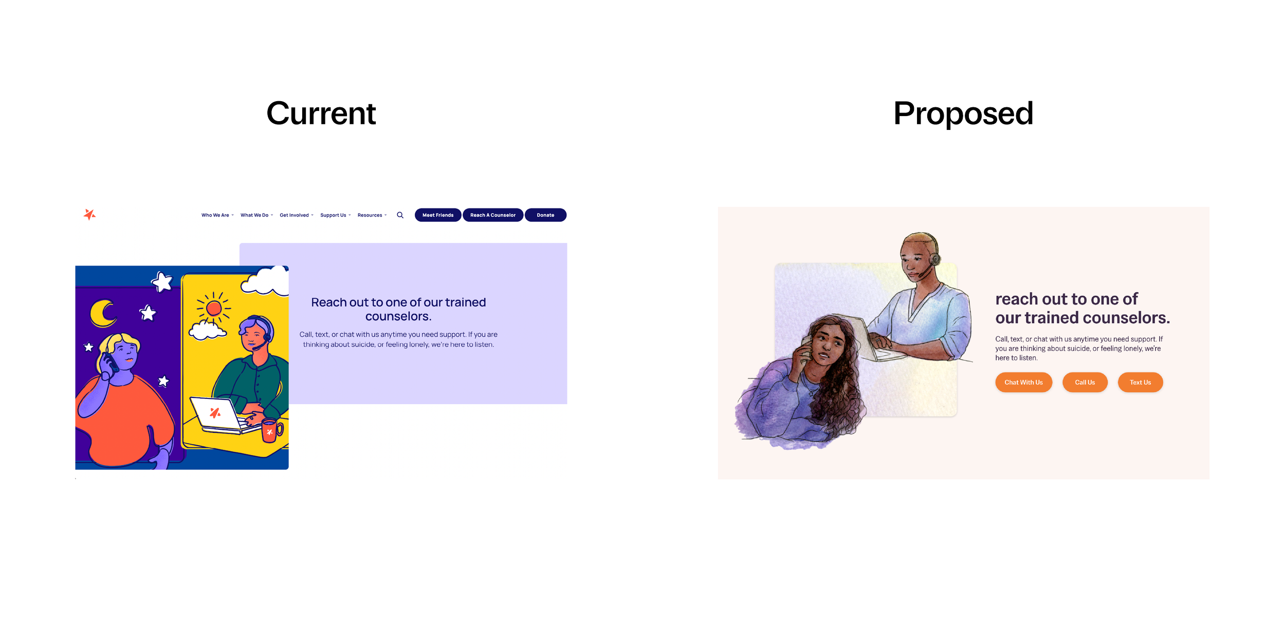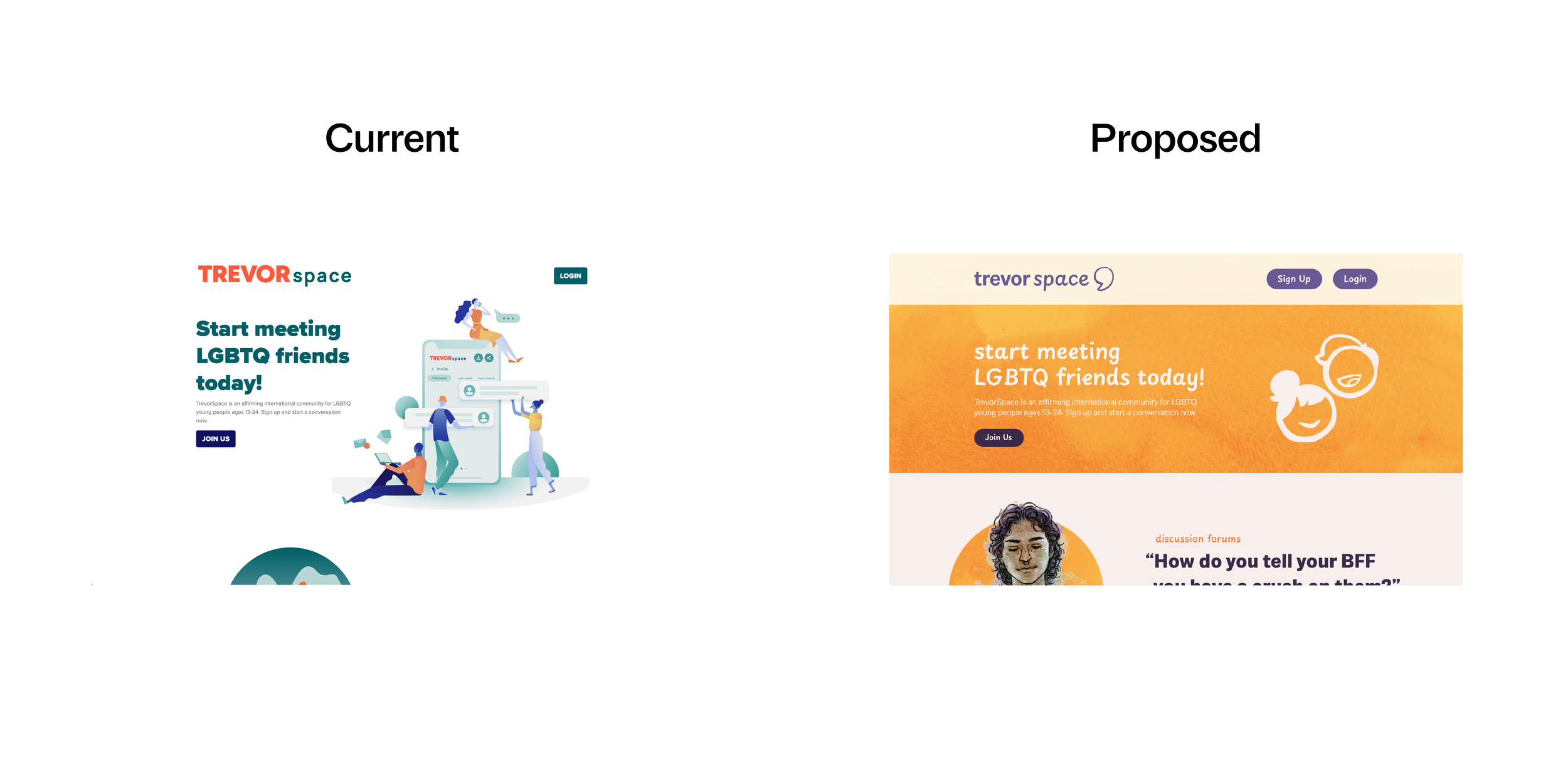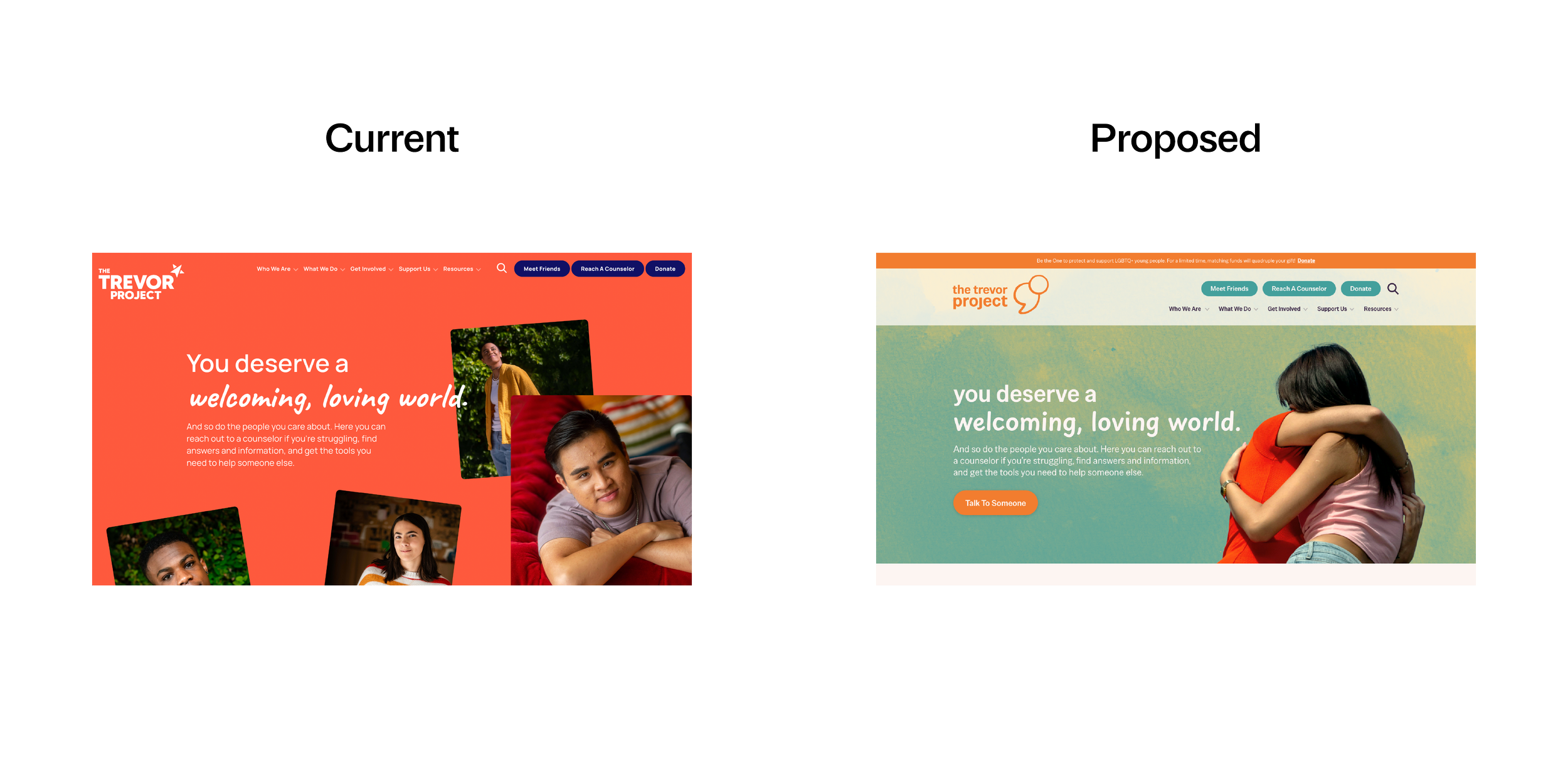 The Trevor Project’s current star logo has few meaningful ties to the brand’s origins or mission. I swapped the star for a new logomark that combines two meaningful icons: a semicolon and a speech bubble.