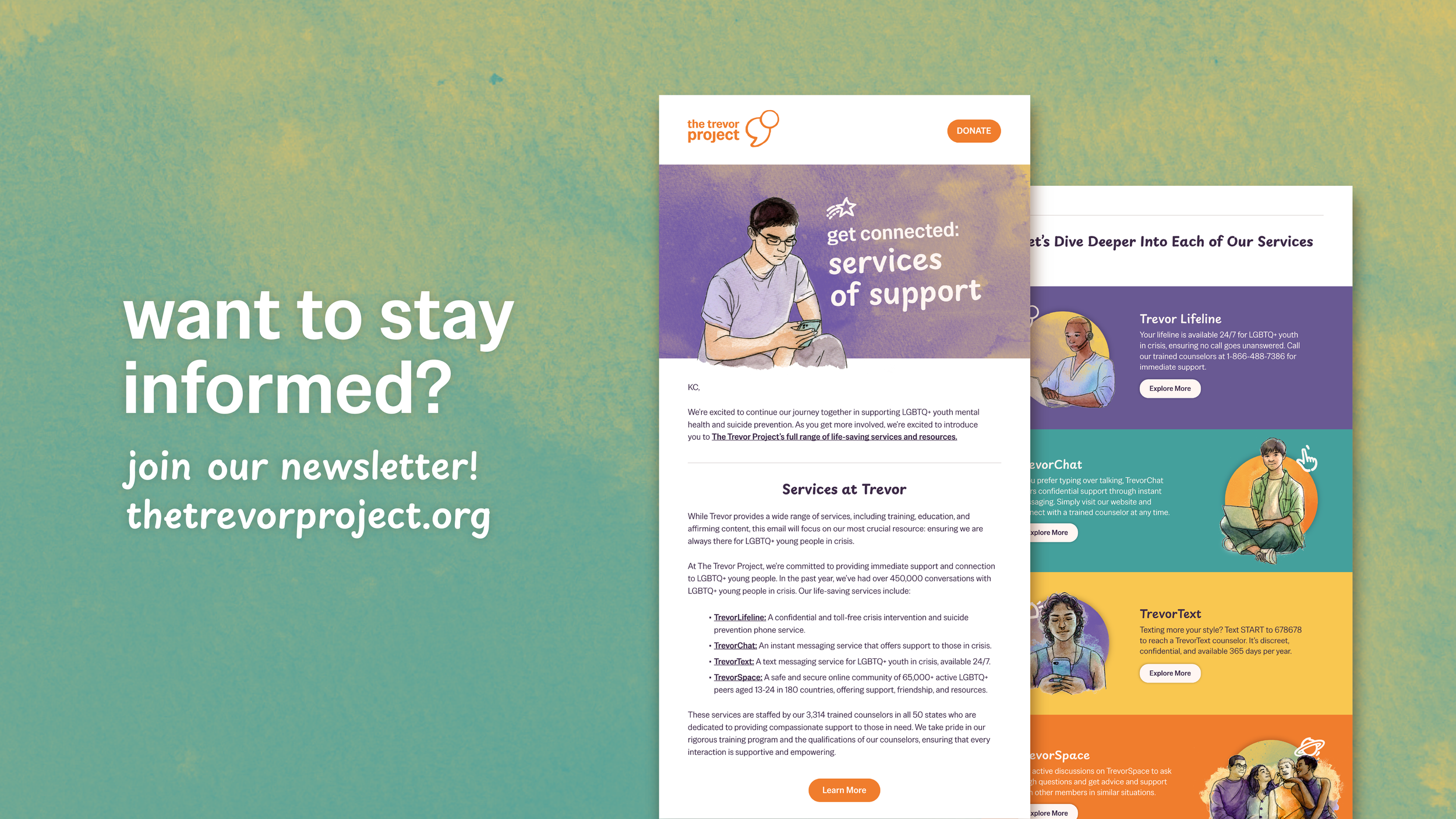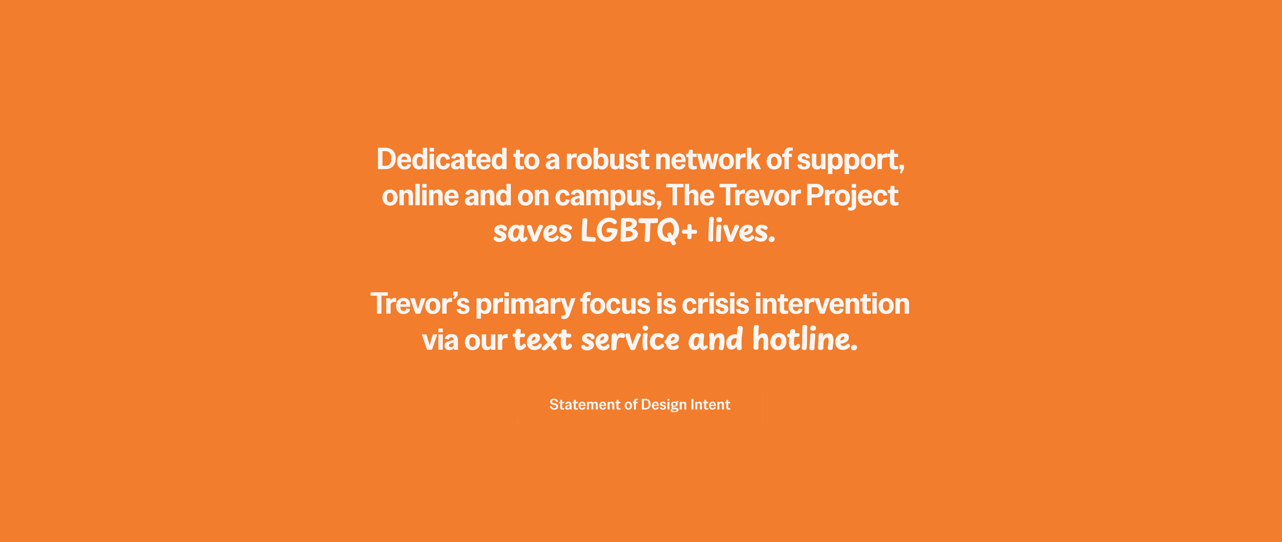 The Trevor Project’s primary features are their hotline, text/SMS, and chat services. This became a focal point; the logo and type treatment should feel like a text message.