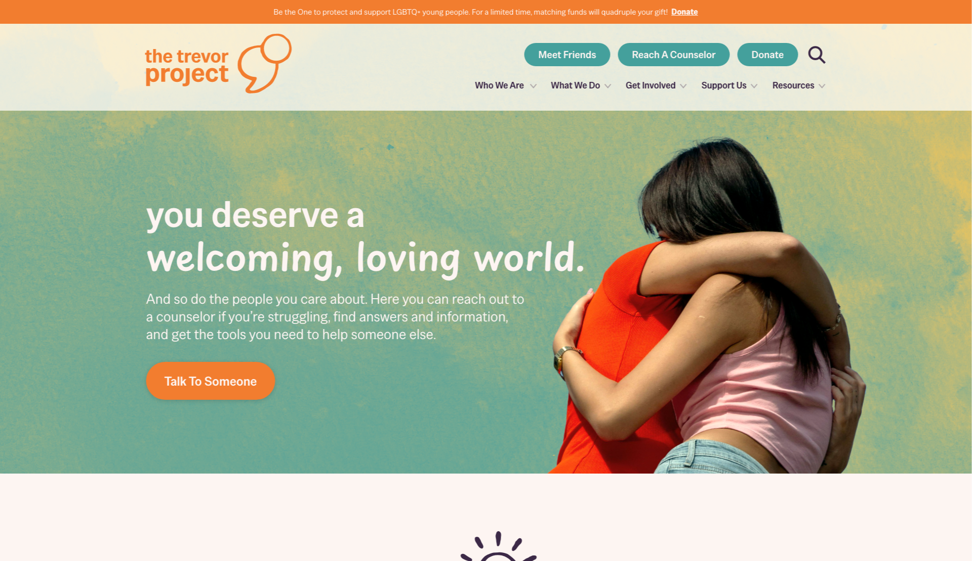 The Trevor Project serves LGBTQ+ people under 25. The organization also provides resources such as training programs for educators, coaches, and parents to support LGBTQ+ youth.