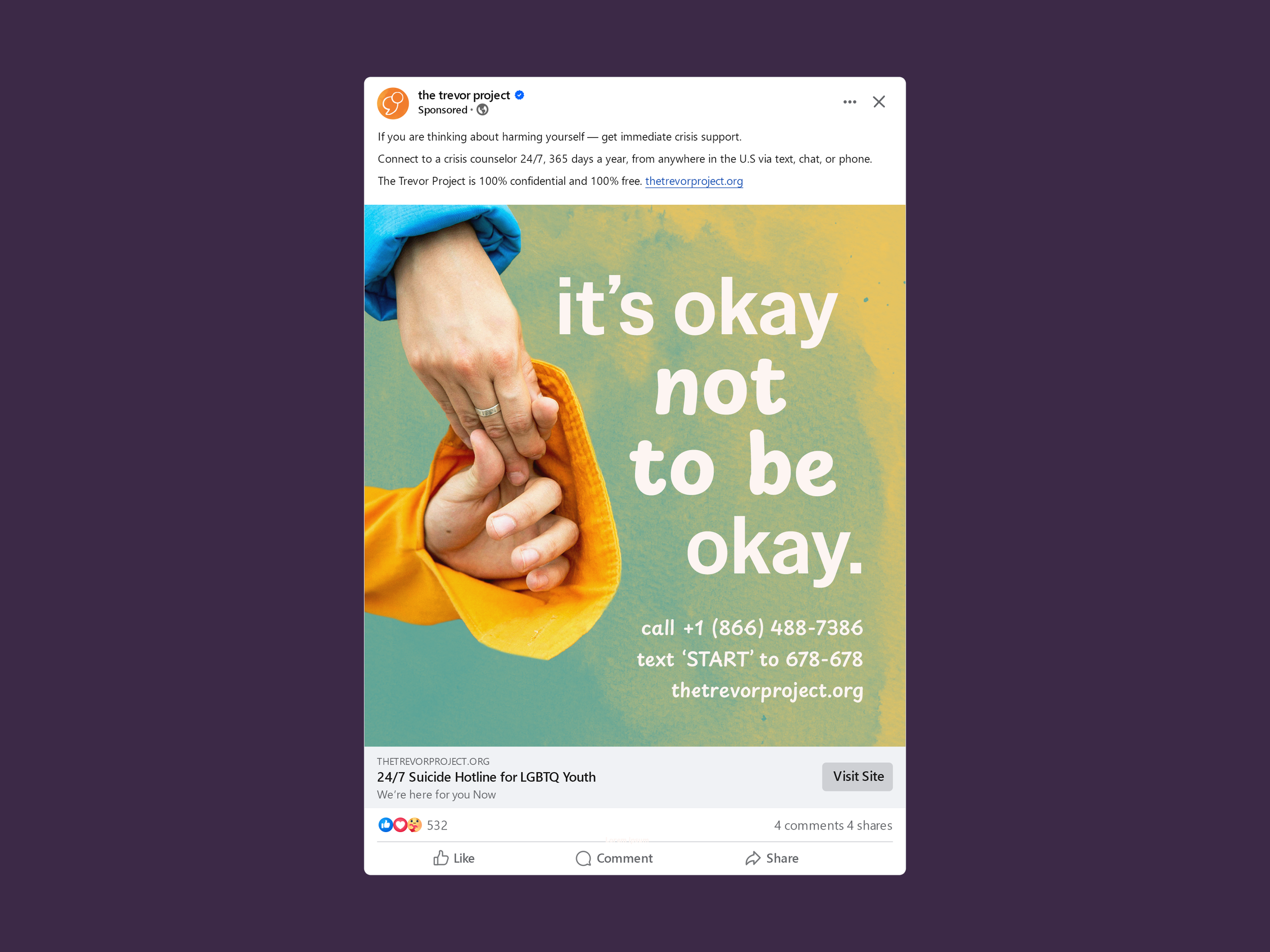 To deepen The Trevor Project’s connection with their audience, my creative decisions were informed how LGBTQ+ young people in crisis actually experience support. This audience turns to the internet first, especially if reaching out to adults in their life feels unsafe. For this refresh, the audience needs to see themselves reflected honestly.